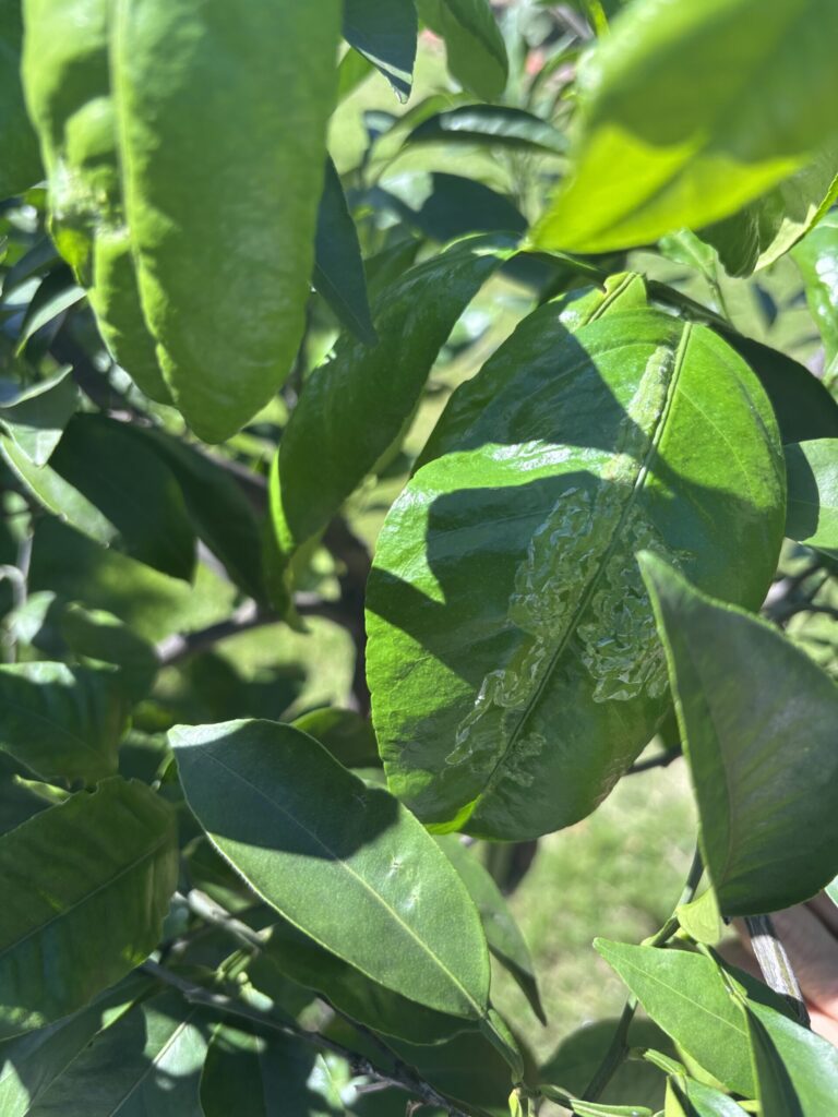 新しい葉っぱは、ハモグリバエに食べられて、まるで地図のよう。