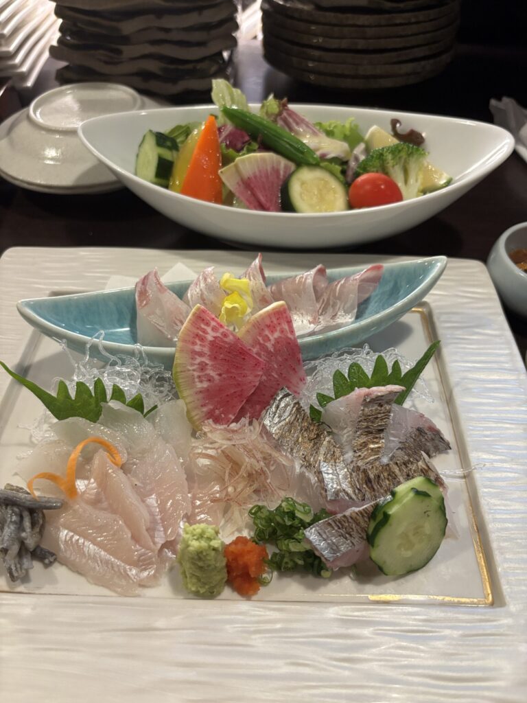 友人は名物の「穴子めし」、私は「お刺身三点盛り」と「野菜サラダ」を注文しました。