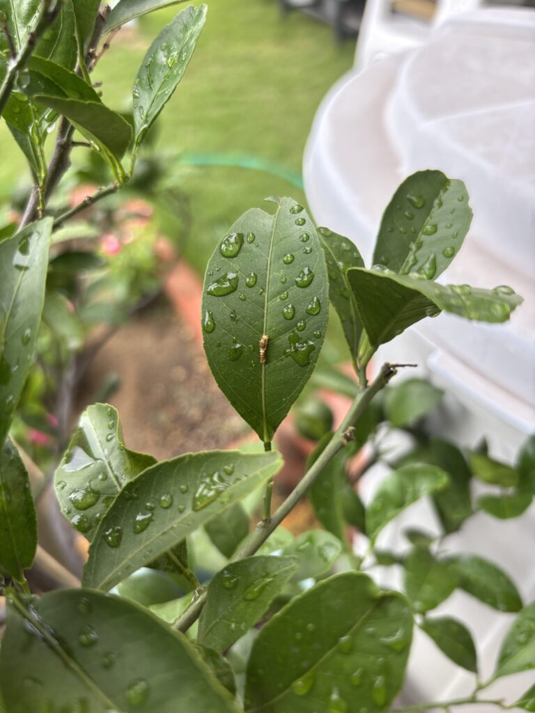 そんな時、アゲハ蝶の幼虫を発見。自然の営みを感じながら、みかんの葉っぱを守りました。